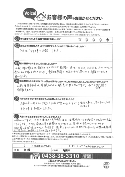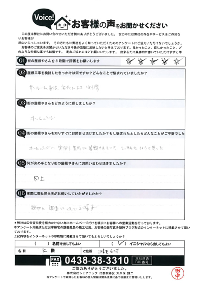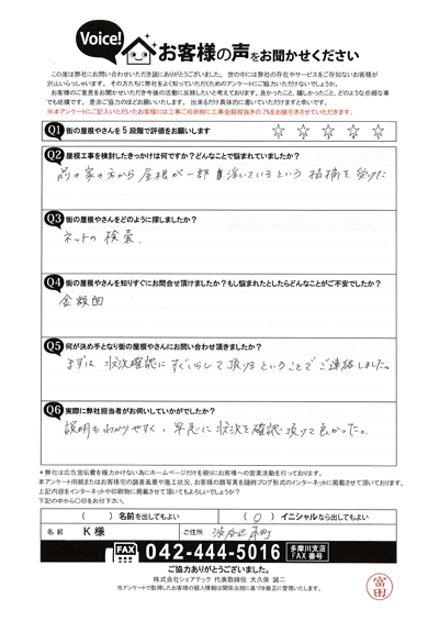 屋根葺き替えをご検討中の西東京市住吉町のK様にアンケートにご協力いただきました