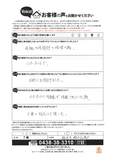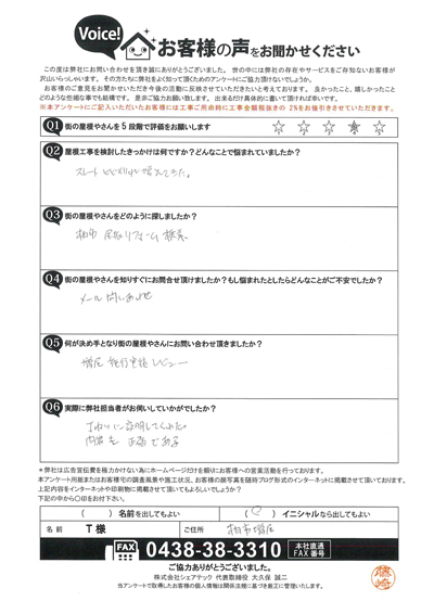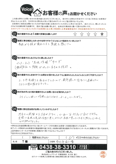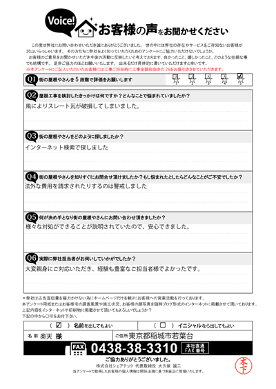 国分寺市高木町にて屋根葺き替え工事を実施、O様よりアンケートをいただきました