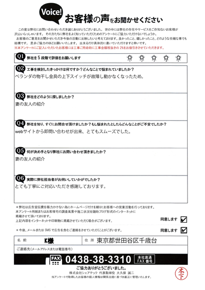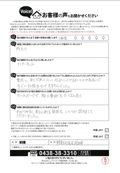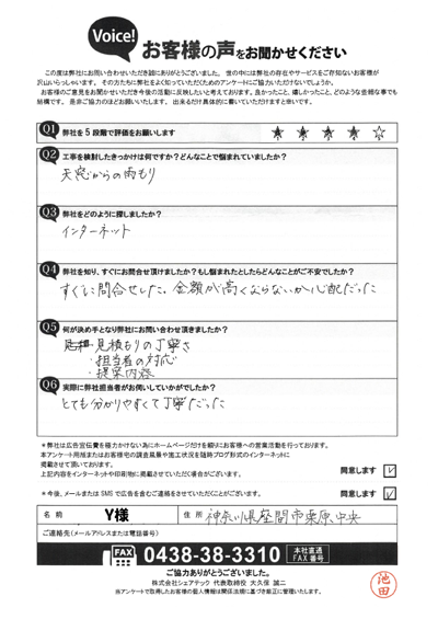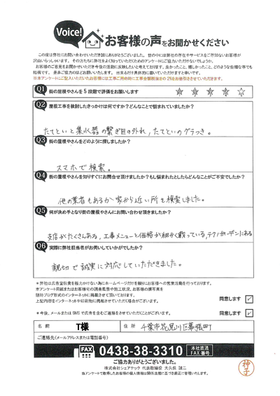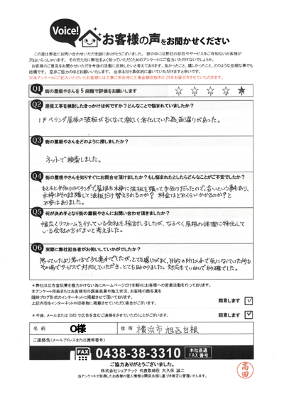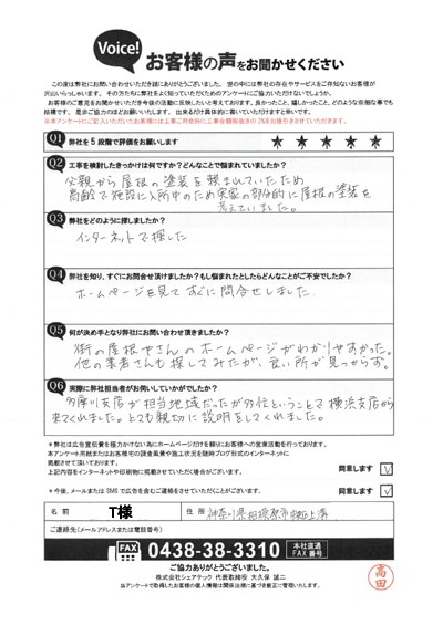 川崎市高津区のお客様アンケート|屋根葺き替え・雨樋交換・天窓工事