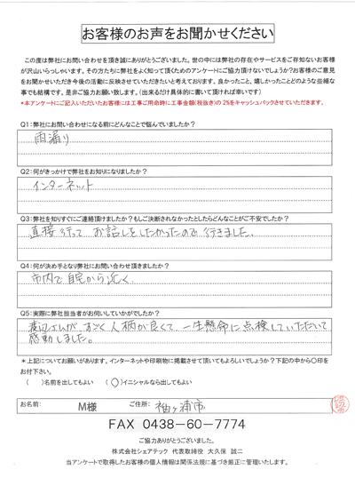 袖ヶ浦市|雨漏りによる修理依頼をいただいたM様