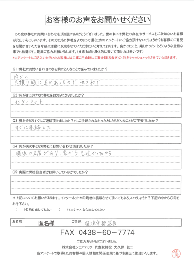 横浜市神奈川区|雨漏り修理見積もり依頼をされたS様
