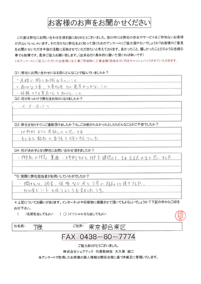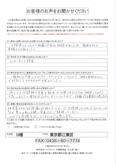 東京都江東区で屋上防水工事の点検を行ったU様の声