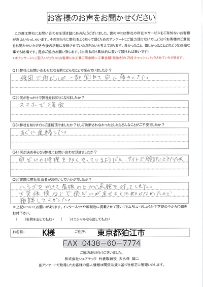 府中市で屋根葺き替え工事の点検を行ったK様の声
