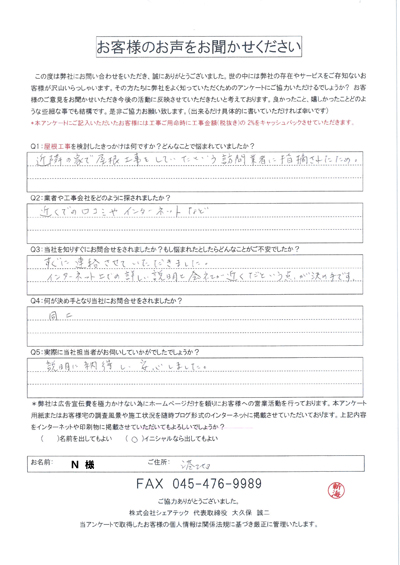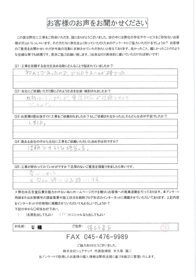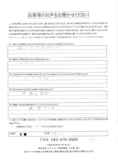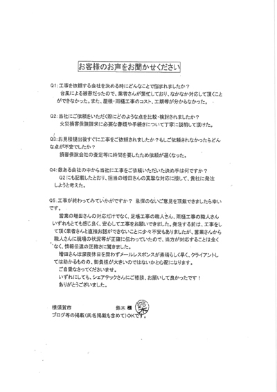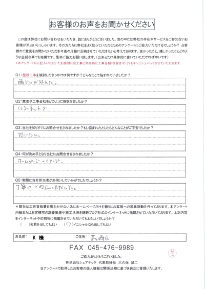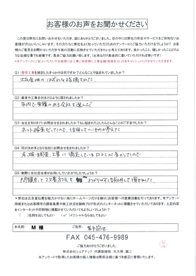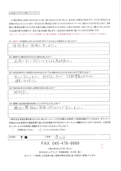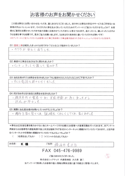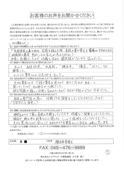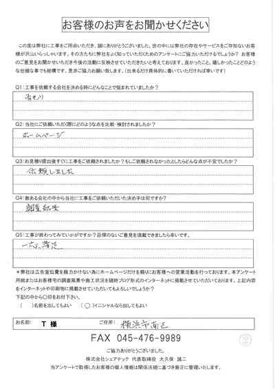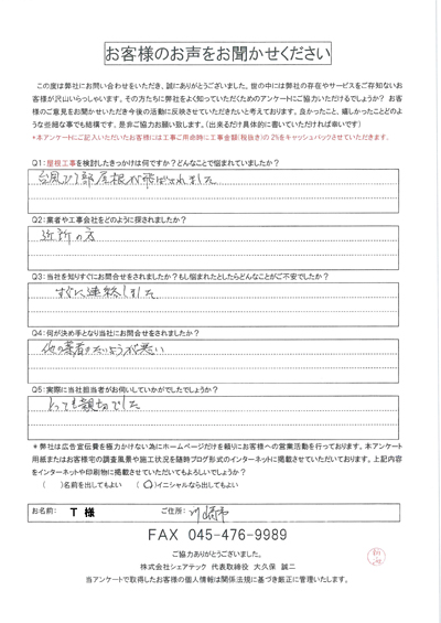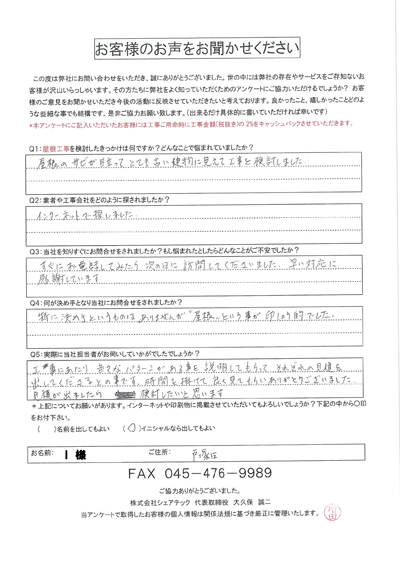 屋根より雨漏りしていた横浜市旭区のT様邸の工事が完工、アンケートをいただきました