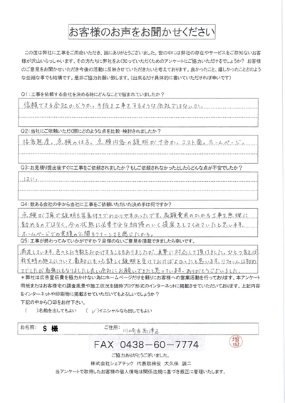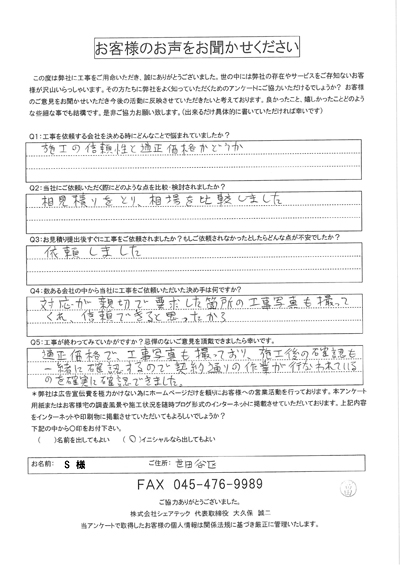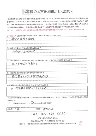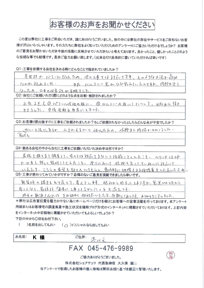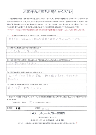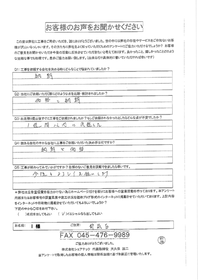雨樋交換工事を行った横須賀市の鈴木様より完工時のアンケートをいただきました