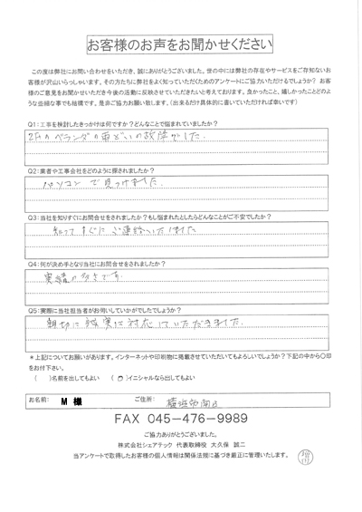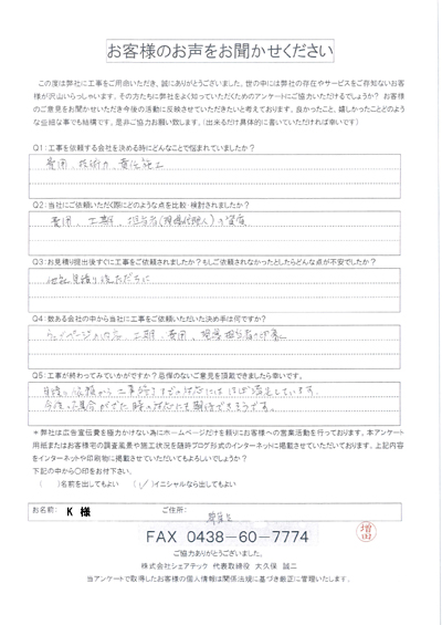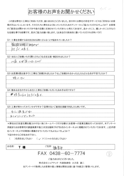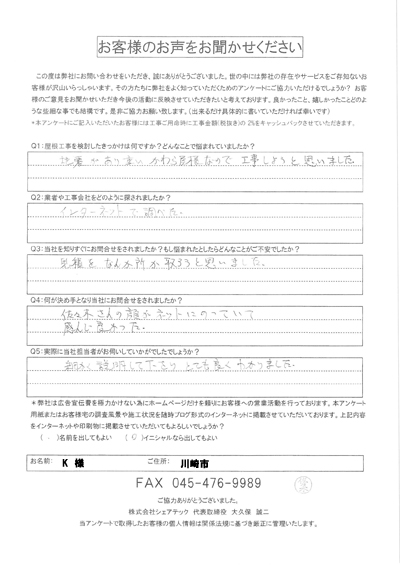 屋根カバー工事を実施した鎌倉市のT様より完工後のアンケートをいただきました