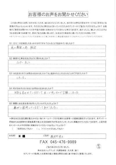屋根の葺き替え工事を実施、青葉区若草台のO様の完工後のアンケート