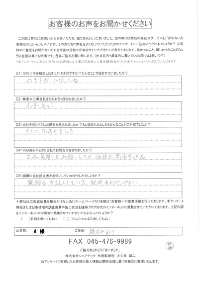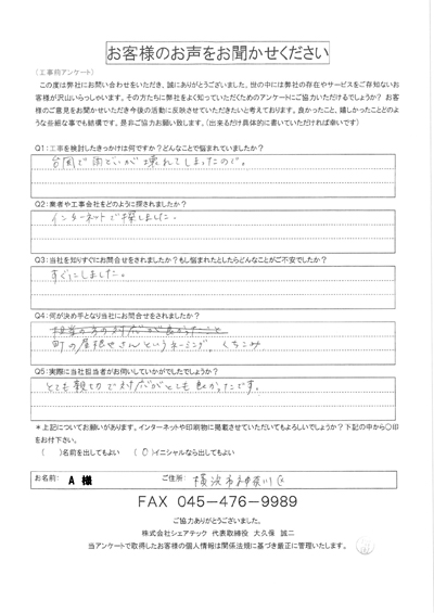 横浜市旭区のA様邸、軒天部分改修工事を実施し、工事後にアンケートをいただきました