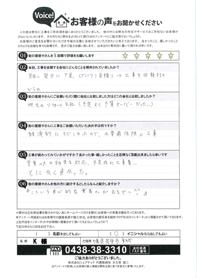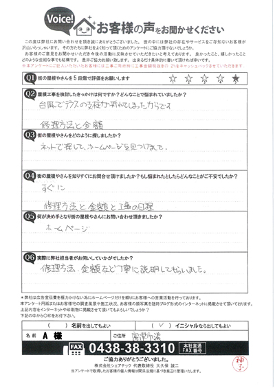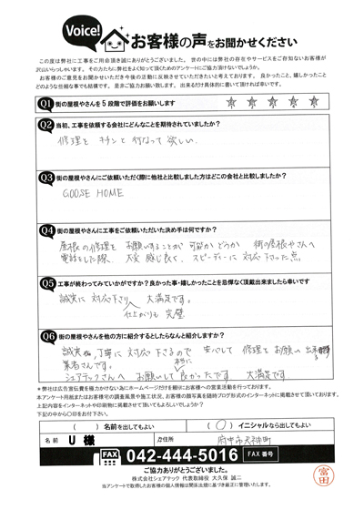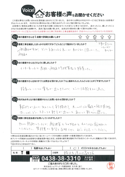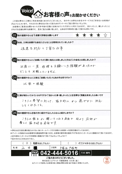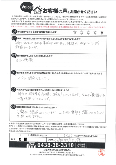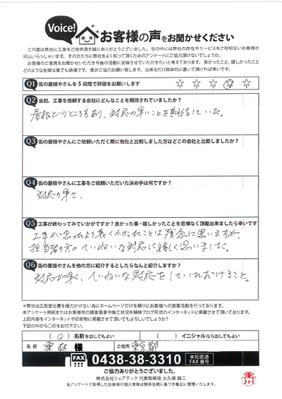 棟板金交換工事を行なった多摩区堰のO様のアンケート
