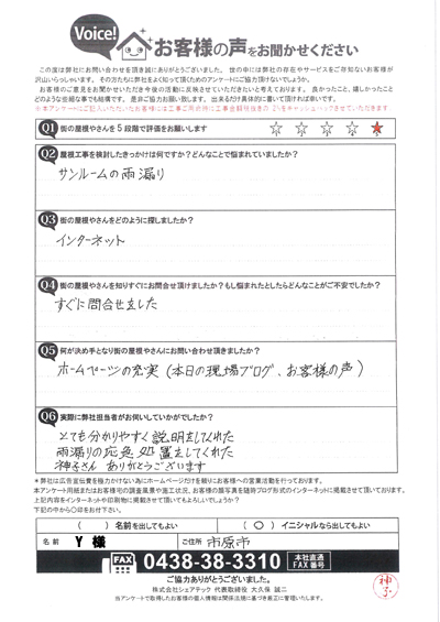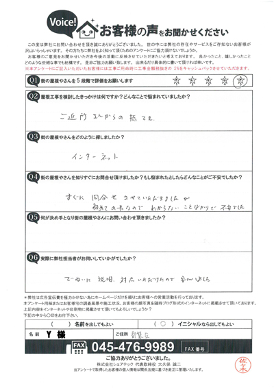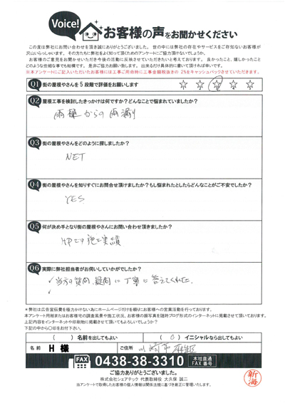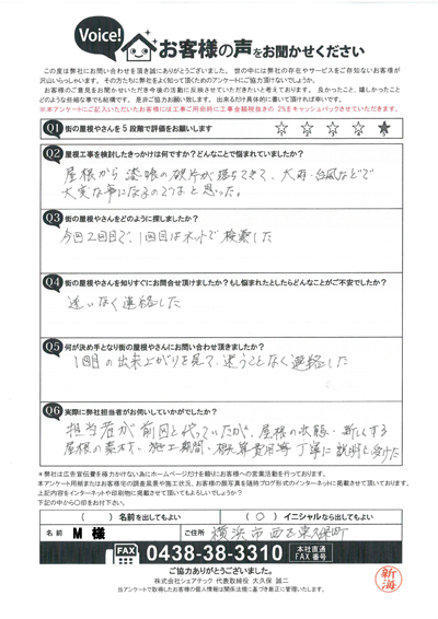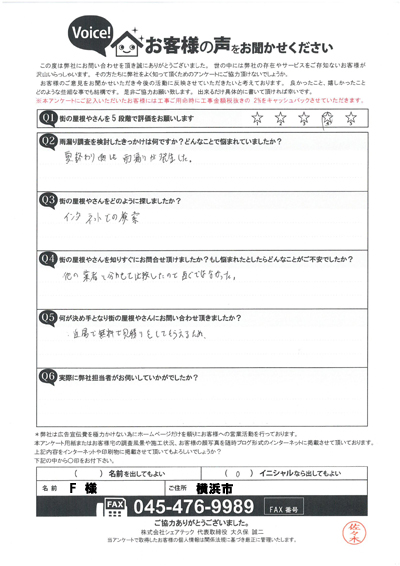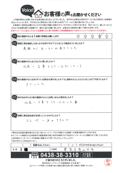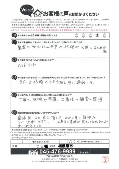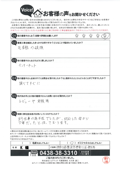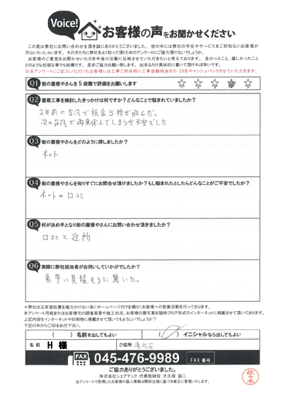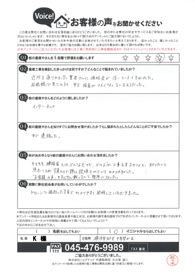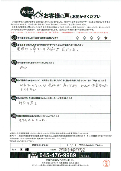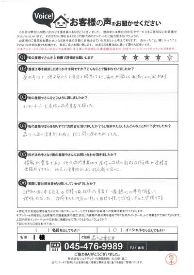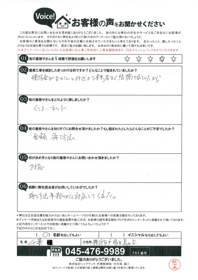 棟板金交換工事を行なった港南区大久保I様のアンケート