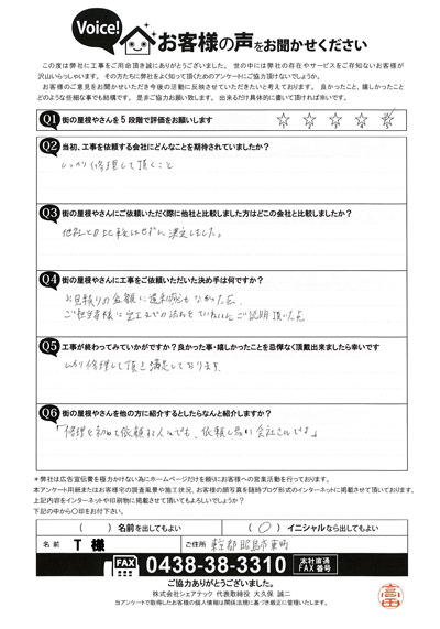 軒天修理を行なった府中市天神町のT様の工事後アンケート