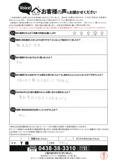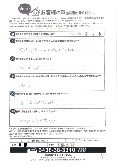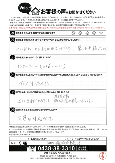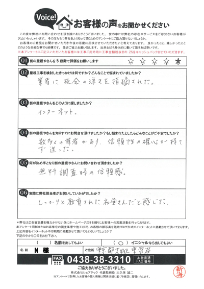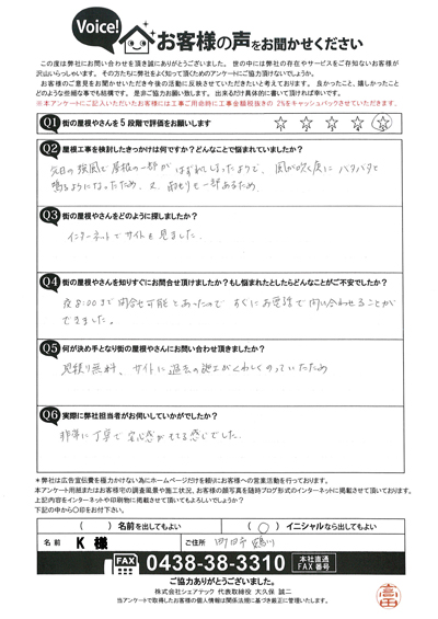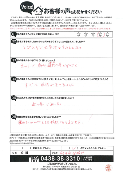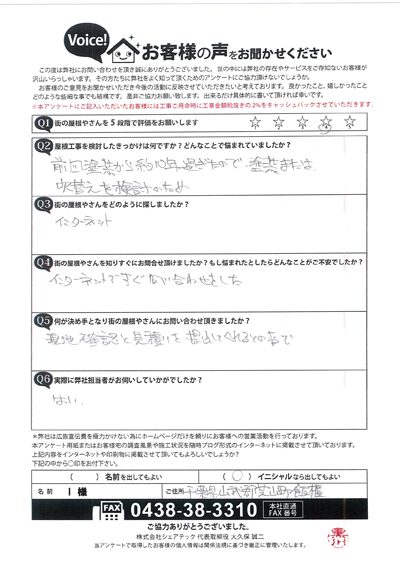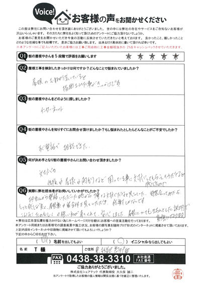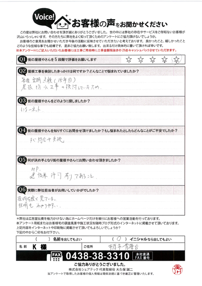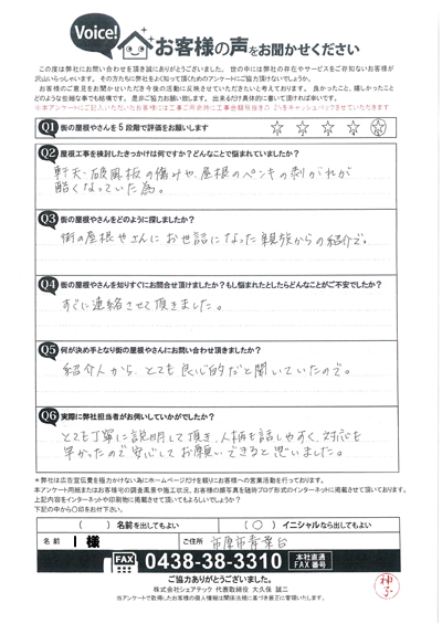 遮熱塗料のサーモアイの色で屋根塗装、木更津市江川H様の工事後アンケート