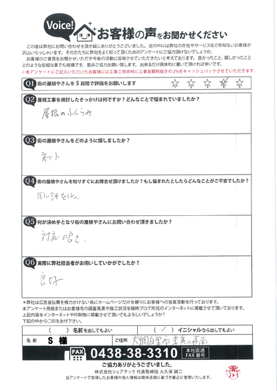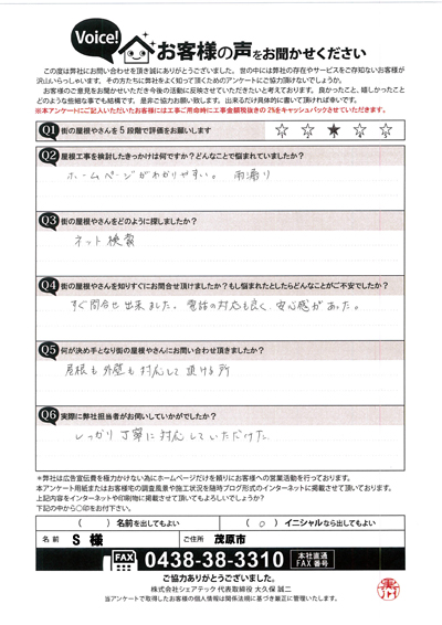 倉庫のトタン屋根補修、市原市うるいど南S様の工事後アンケート
