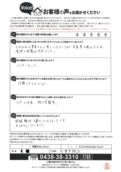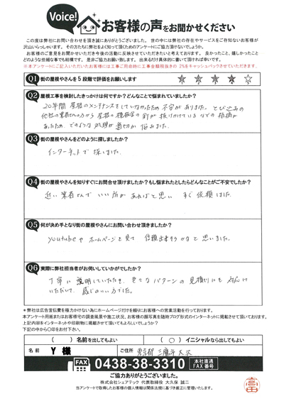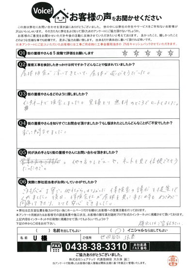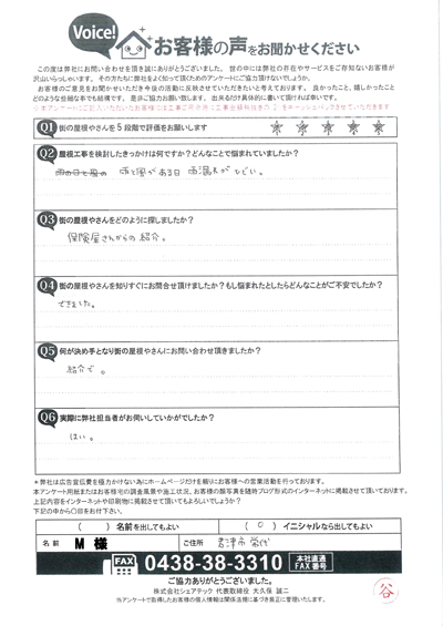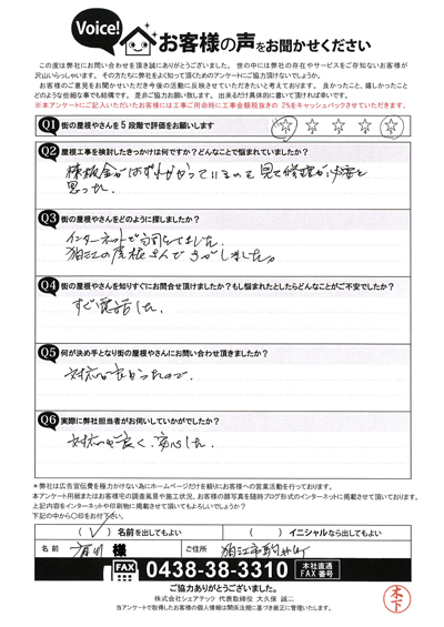 雨漏りが発生していた市原市五井のT様の点検後アンケート