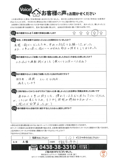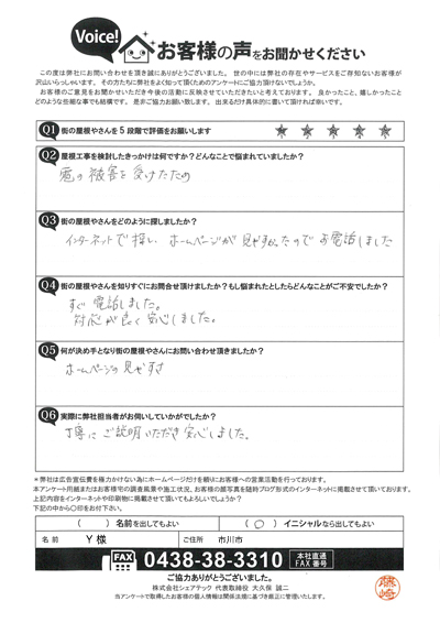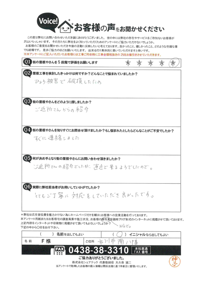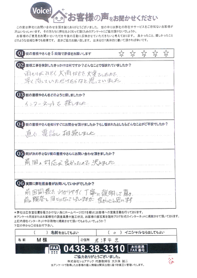 柏市で軒天の現地調査、補修工事をご提案させていただいたF様のアンケート