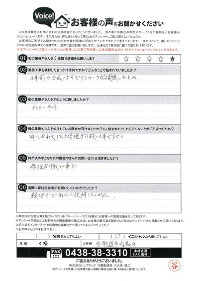 君津市のお客様の声、板金工事前後にアンケートをいただきました