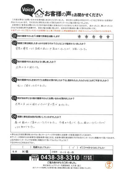 横浜市保土ケ谷区鎌谷町のH様へ屋根葺き替えのご提案、工事完了後のお客様の声
