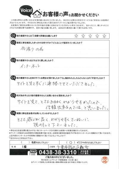雨漏りについてお問い合わせ、千葉市稲毛区轟町I様の現地調査終了後のご感想