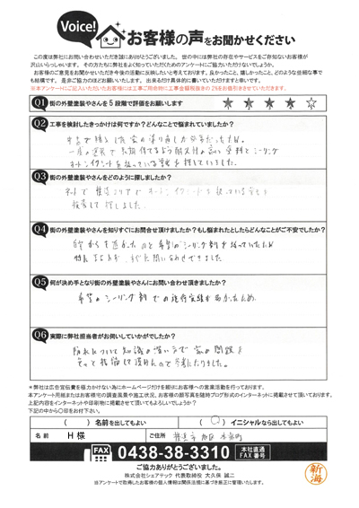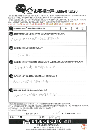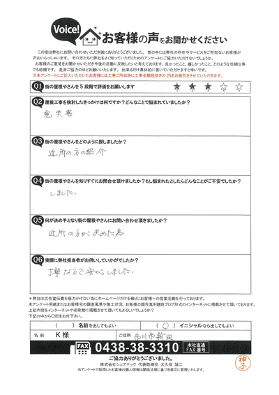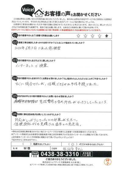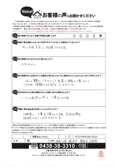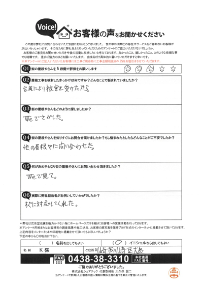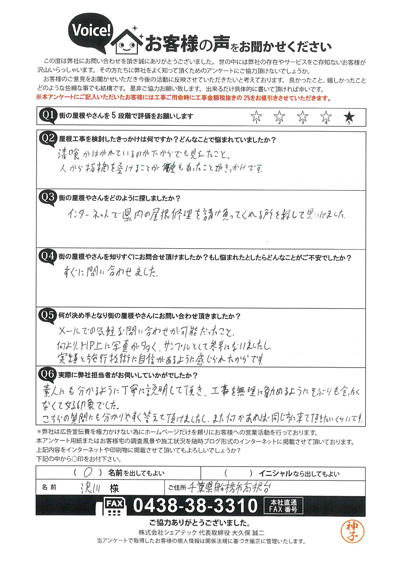 大網白里市のお客様邸の雨漏り修理を実施、アンケートをいただきましたのでご紹介いたします
