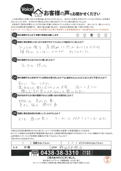 横浜市磯子区栗木で屋根カバーと軒樋交換工事、お客様よりアンケートをいただきました