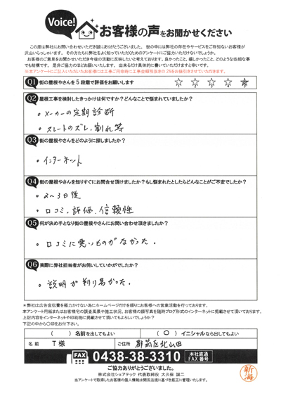 屋根カバー工法を行なわせていただいた横浜市金沢区六浦T様のアンケート