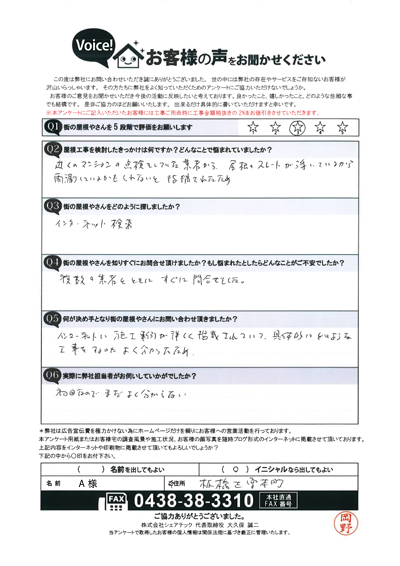 屋上防水工事を実施、横浜市保土ケ谷区新井町のお客様よりアンケートをいただきました