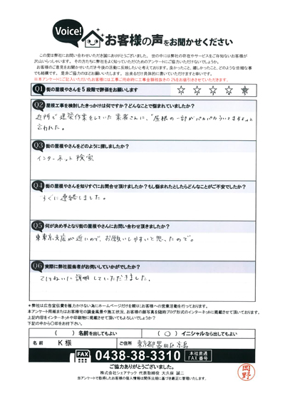 他業者様より屋根についてご指摘を受けた墨田区京島K様の点検後のアンケート