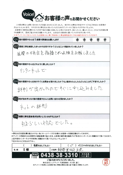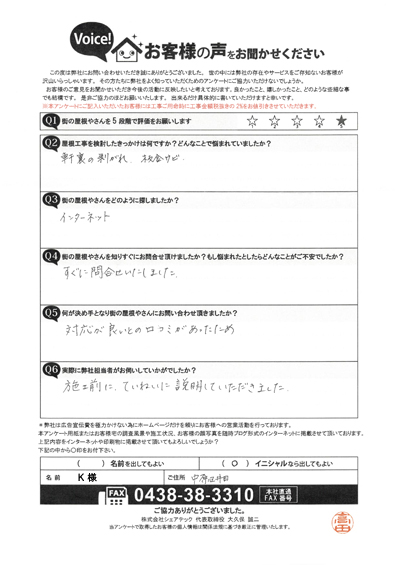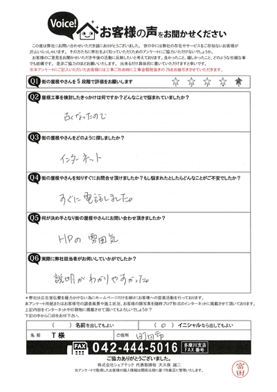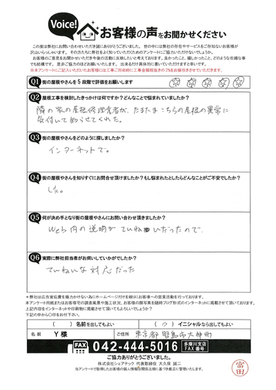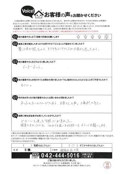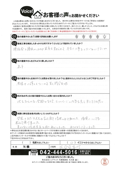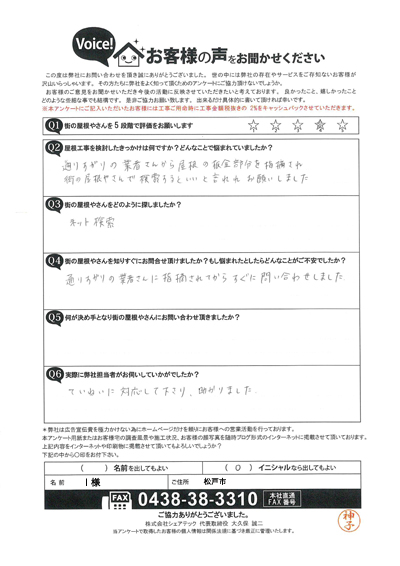 屋根点検を行なわせていただいた練馬区高松のA様、終了後のアンケート
