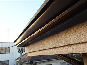 右写真で分かりますが、手前のケラバ部分も破損しているようです。ケラバとは屋根の外壁から出ている屋根部分で雨樋の付いていない部分を言います。