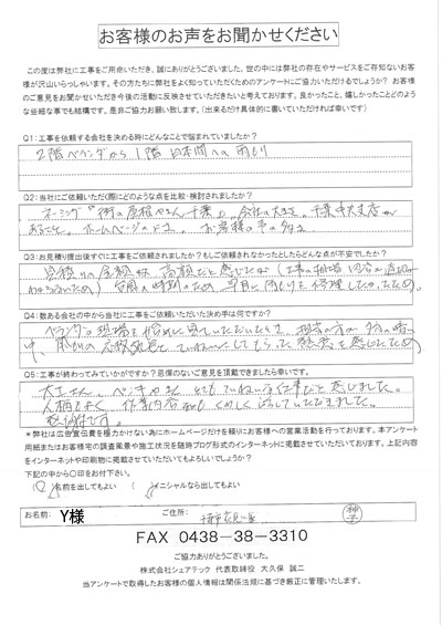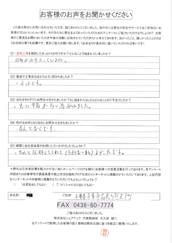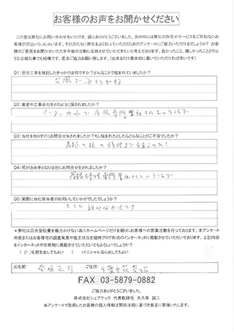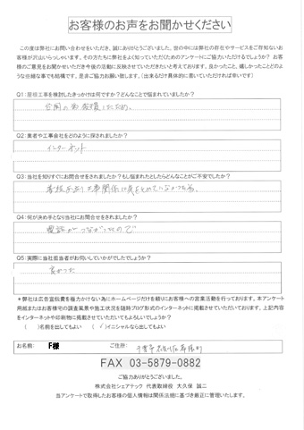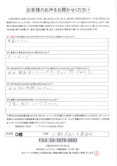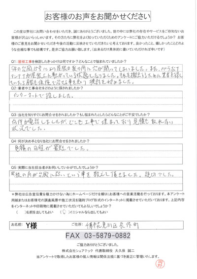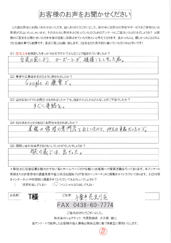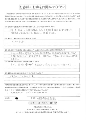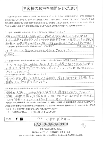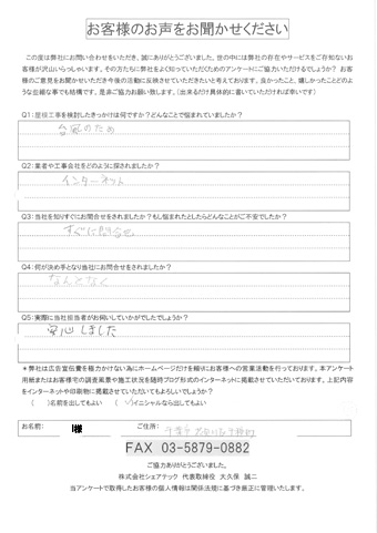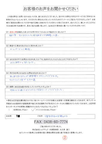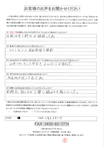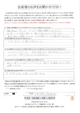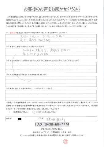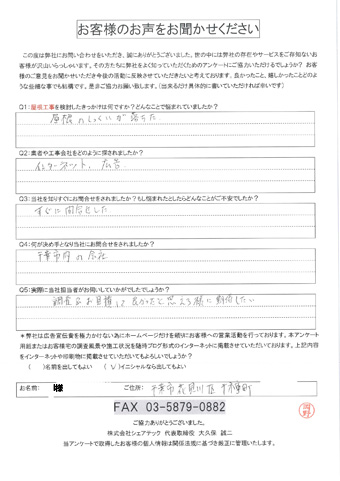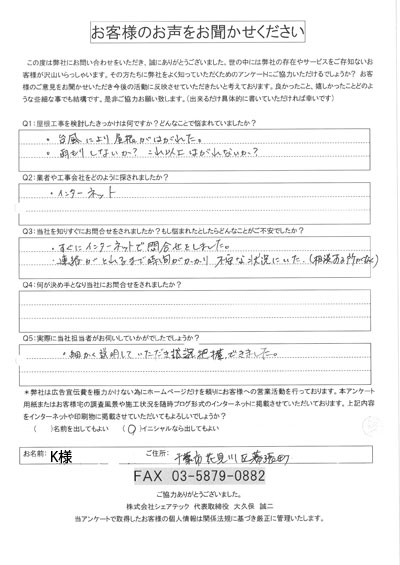 屋根の瓦が落下した花見川区検見川町のお客様の調査後アンケート