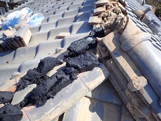 屋根は大波スレート、壁はコンクリートブロックで構成されたプロパンガス庫です。屋根の一部が欠けてしまったことで、コンクリートブロックの壁が濡れています。プロパンガス庫内にも雨が吹き込んでいることは確実でしょう。建築されてから30年以上が経過しているということで、大波スレートに汚れが堆積しています。
