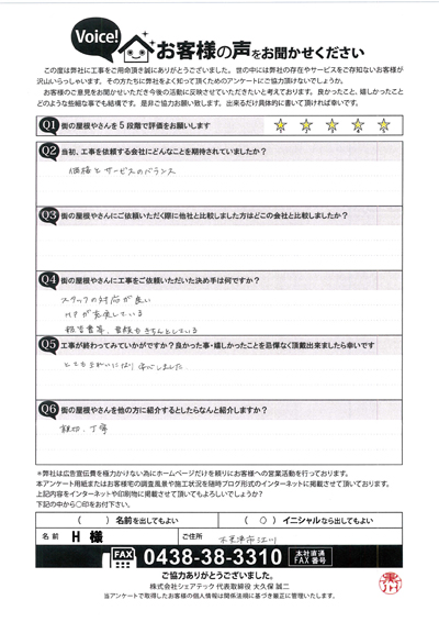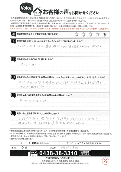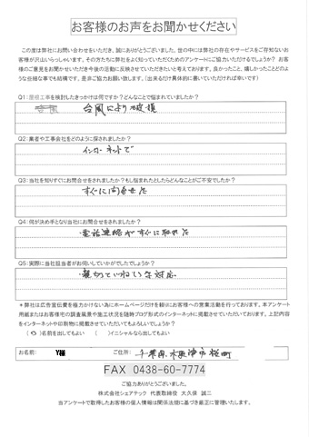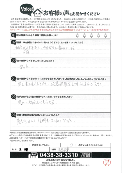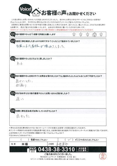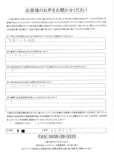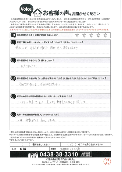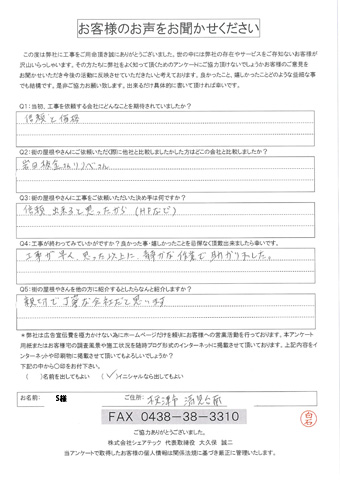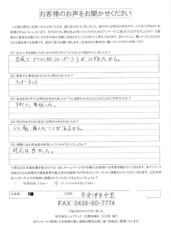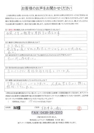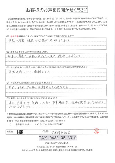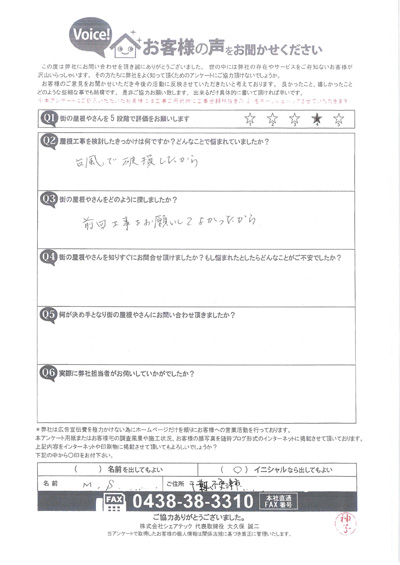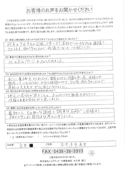 金額がかかる工事なので、一週間程、考えましたが、(台風被害部分だけの修理か全体を修理か?)信頼できる会社と考え、お願いする事にしました。