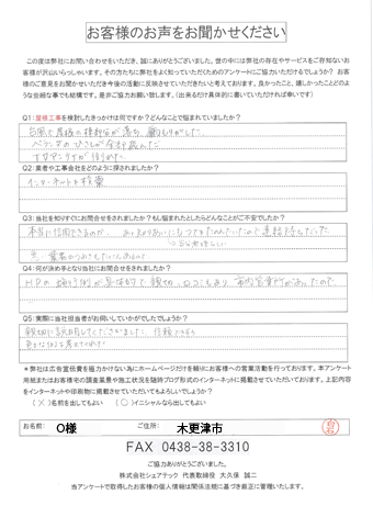すぐに連絡をとりましたが、被害を受けた件数が多いため、見積りや訪問していただくのにかなり時間がかかり、その間、雨も多かったので屋根は大丈夫かが心配になりました。