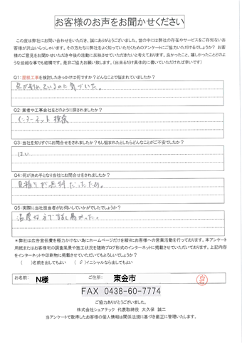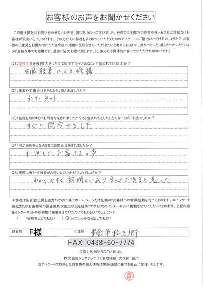 破風板の調査をさせていただいた東金市田間H様のアンケート