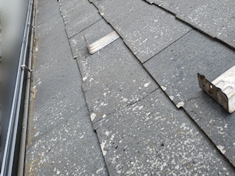 雨漏りの位置を確認し、屋根の状況を確認したところ、屋根材に割れなどの症状は見られません。最近のお住いのメンテナンス状況をお伺いしたところ、「5年程前に屋根の塗装を行った」との事ですので屋根塗装の施工状況を確認したところ、屋根材同士の隙間が塗料で埋まってしまっている状態でタスペーサーの設置もされていませんでした!(>_<;) 雨漏りの原因は、塗料で屋根材同士の隙間を埋めてしまったことだとわかりました。