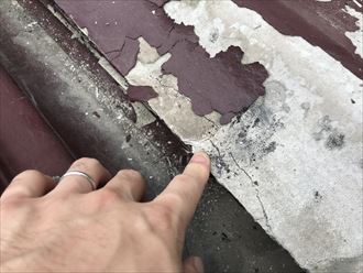 屋根調査を行ったところ、前回の塗装が20年程前と年数が経過していることもあり全体的に塗膜の剥がれ見られ塗装の劣化に伴い撥水性が失われてしまいますので表面の汚れや苔の発生にも繋がっておりました(>_<) また、前回の屋根塗装工事ではスレートの重なり部分の縁切りがされておらず縁切り不足の状態となっておりました。スレートの重なり部分を塗装の際に塗料で塞いでしまうと雨水や湿気等の水分の逃げ場が無くなり雨漏りや内部結露の原因となってしまいます!(/_;)