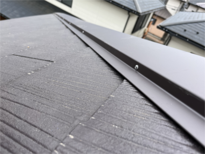 タスペーサーを使った縁切りと、棟板金のケレンを行います。