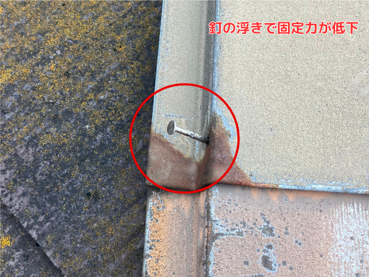 - ●釘の浮きは金属の膨張や収縮、さらには錆びや貫板の劣化、腐食などによって引き起こされる可能性があります。