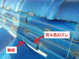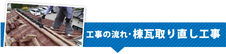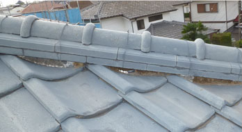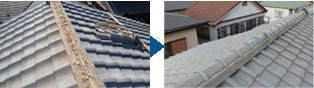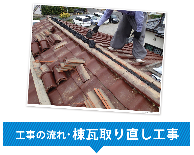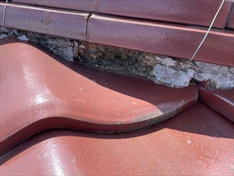棟瓦取直し工事は棟瓦(屋根の頂上部分の瓦)を一旦取りはずし、再度漆喰を詰め直して、取りはずした棟瓦を再び設置していきます。瓦がズレたり、漆喰が剥がれてほとんどなくなってしまっていたりと重症な場合に行われます。
