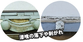 漆喰の歴史は古く、約5000年前から世界中で使われています。瓦や石材の接着、目地の充填、壁の上塗りなど漆喰は様々な場面に用いられてきました。日本が世界に誇る世界遺産「姫路城」、その白鷺と形容される美しい白壁にも漆喰が用いられています。 瓦屋根では瓦の固定や接着に漆喰が用いられています。この漆喰も風雨や寒暑、直射日光に晒され続けているので、他の屋根材と同じように時間とともに劣化していきます。目視して、ひびや剥がれが出ている場合は危険です。固定している力が弱まっているので、ちょっとした風や地震で瓦がズレたりします。最悪の場合は落下してしまう可能性もあります。また、ズレた瓦同士が干渉し合って欠けたり・割れたり、そこから雨水が浸入して雨漏りになったりと様々なトラブルを招きます。