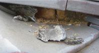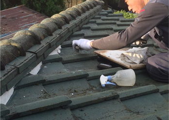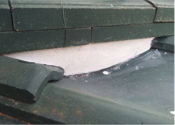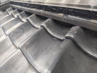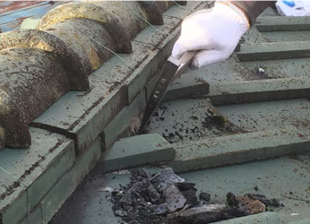 詰め直し補修はまず古くなった漆喰を取り除くことから始めます。既存の漆喰が残った上に新しい漆喰を詰めてもすぐに剥がれてしまいます。ですのでしっかり取り除いて清掃を行います。右写真をご覧下さい。漆喰を除去した下に茶色い土が見えるのがお分かりいただけると思います。漆喰は経年変化によってひび割れを起こします。漆喰がボロボロになって剥がれると中の土が出てきてしまうので、傷みが見られたら早めに手当てをする必要があります。