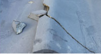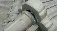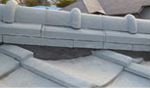 棟は本来まっすぐになっていなけれなりませんが、ご覧の様に曲がっているのがお分かりいただけるでしょう(左写真)。これは漆喰の大部分が剥がれているためです(右写真)。漆喰が剥がれると中の土が水分を吸って傷みます。それによって棟の固定力が弱り曲がってしまうのです。