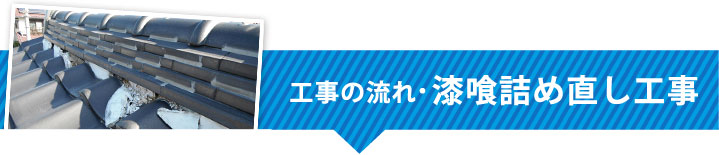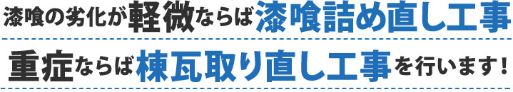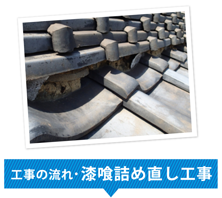 漆喰詰め直し工事は文字通り、漆喰を詰め直すものです。漆喰の崩れや剥がれなどの劣化が比較的軽微な場合に行われます。