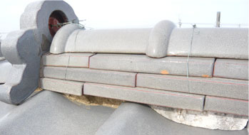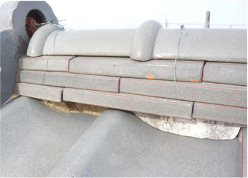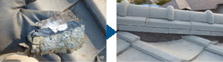 のし瓦と土で作った土台の上に棟瓦を設置します。左写真が設置前です。ここに更に土を盛り込んだ後、棟瓦を被せます。のし瓦と屋根瓦の間に漆喰を詰め、銅線で固定していきます(右写真)。