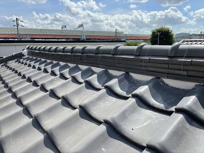 鬼瓦を元の位置に戻し、漆喰で固定します(左写真)。漆喰が乾けば、棟瓦取り直し工事は完了となります。まっすぐな棟は見ていて気持ちが良いものですね!