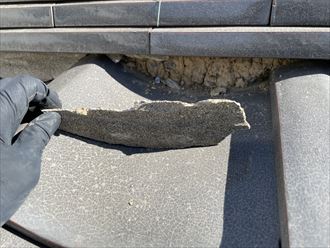 左写真は棟瓦を取り外したところです。棟瓦の下には土が盛られています。更にその下に設置されていた、のし瓦も撤去します(右写真)。その下にも土が盛ってあります。この土は棟の大事な土台になっており、漆喰が剥がれて土が流出してしまうと棟を支えられなくなってしまうのです。