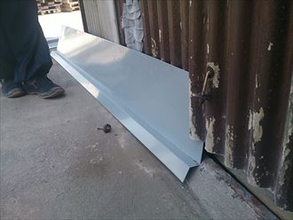 現場調査での採寸を元に工場にてプレスしてきたガルバ鋼板製の水切りです。壁の内側に入り込む立ち上がりの部分も余裕を見ています。これなら雨が入り込む余地はありません。隙間を開けたとはいえ、水切りを入れ込んでいくのはコツが必要です。