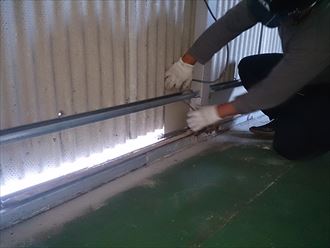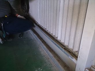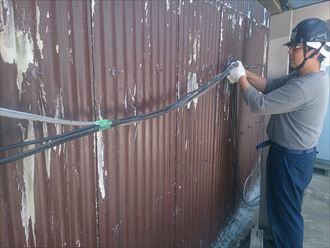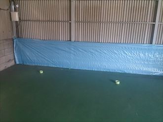 水切りを入れるためにスペースを作らなければいけません。その為には既存の小波スレート材の下端を切断いたします。屋内に埃が極力たたないようにブルーシートにて養生を行うのとともに、外側も電線等を傷つけない様に刃物があたらない場所へ移動いたしました。