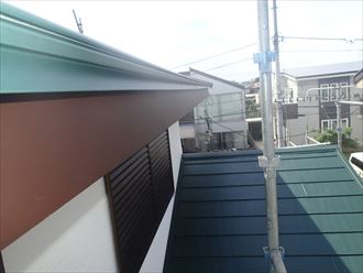 木製の破風板周りは、今回のリフォームコンセプトである省メンテナンス、高耐久に合わせて板金にてすべて覆いました。屋根の緑、外壁の白と茶にもとてもよく合っています。