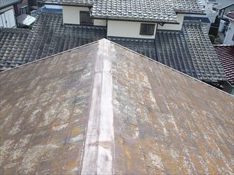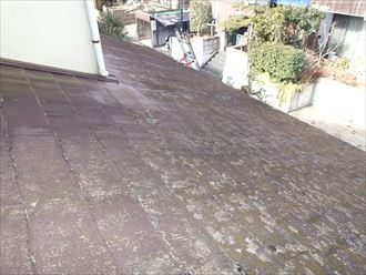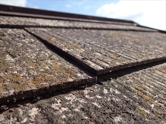 建物の下側から進めた点検も屋根に移りました。屋根のスレート材に割れやヒビの確認はほぼありませんが、全体を覆う苔が非常に目立ちます。塗膜がほぼ無い状況です。